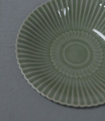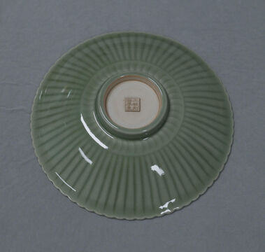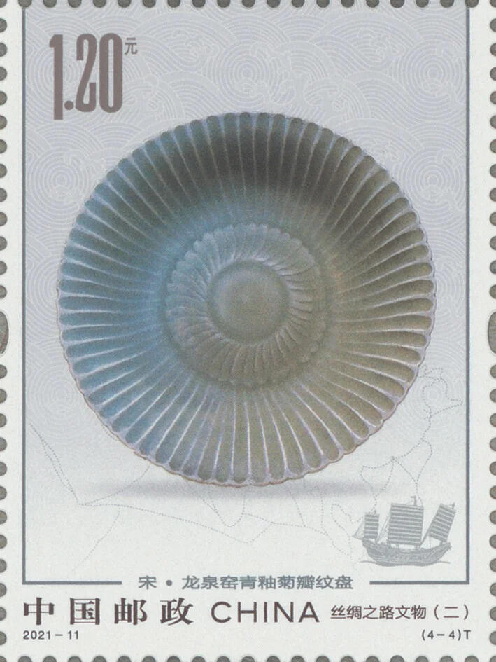 This celadon plate with chrysanthemum-petal decoration derives its form from the celebrated Longquan kilns of the Song dynasty. A historic example of this design was recovered from the “Nanhai No. 1” Southern Song shipwreck, one of the most important maritime archaeological discoveries in China. Its cultural significance was further recognized on June 12, 2021, when China Post issued a special commemorative stamp featuring this motif, acknowledging its enduring place within the legacy of Chinese ceramic art.